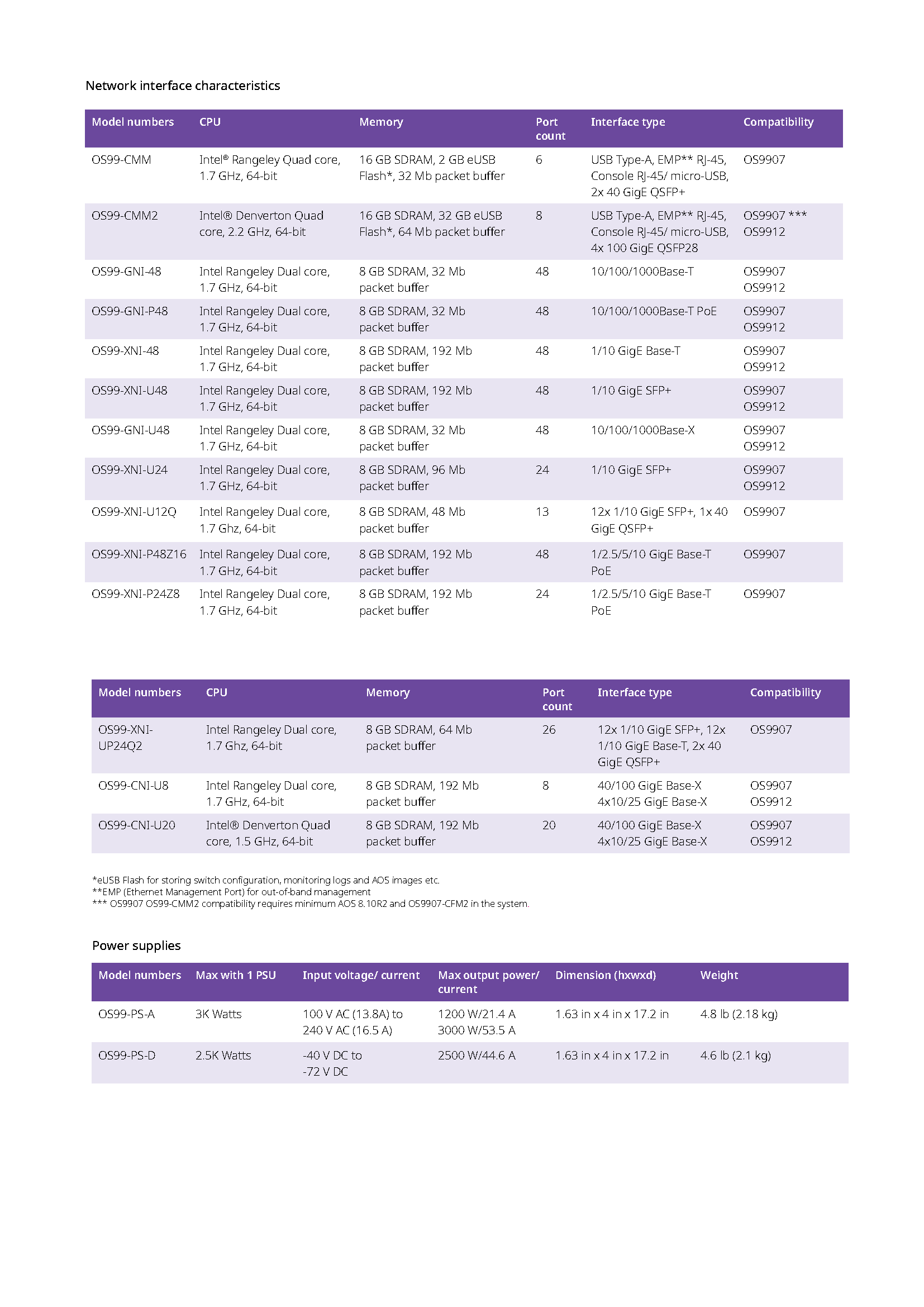 • 以 40/100G、10/25G 和 10/100/1000Base-T 的速度為乙太網路提供線速無阻塞交換與路由效能