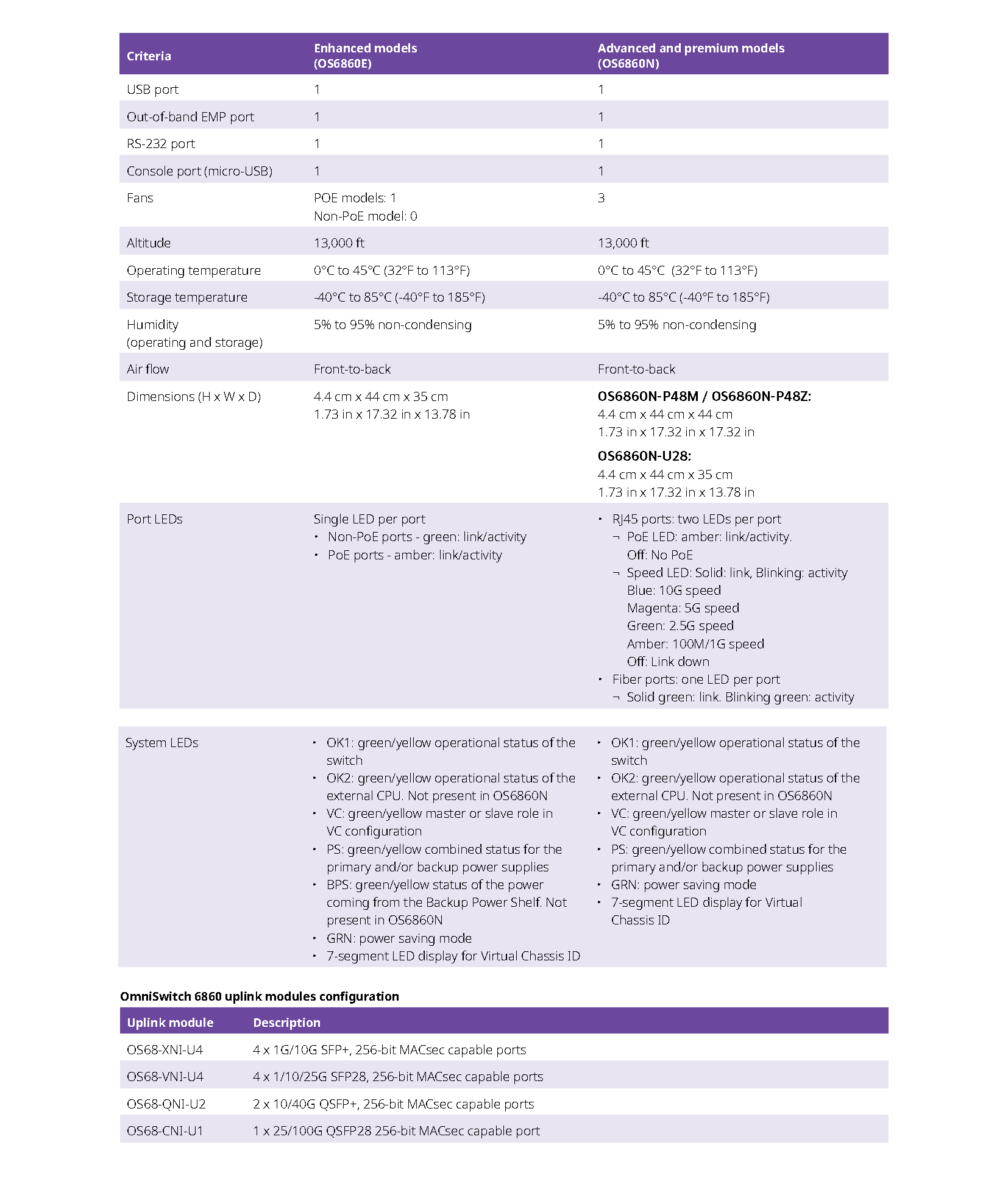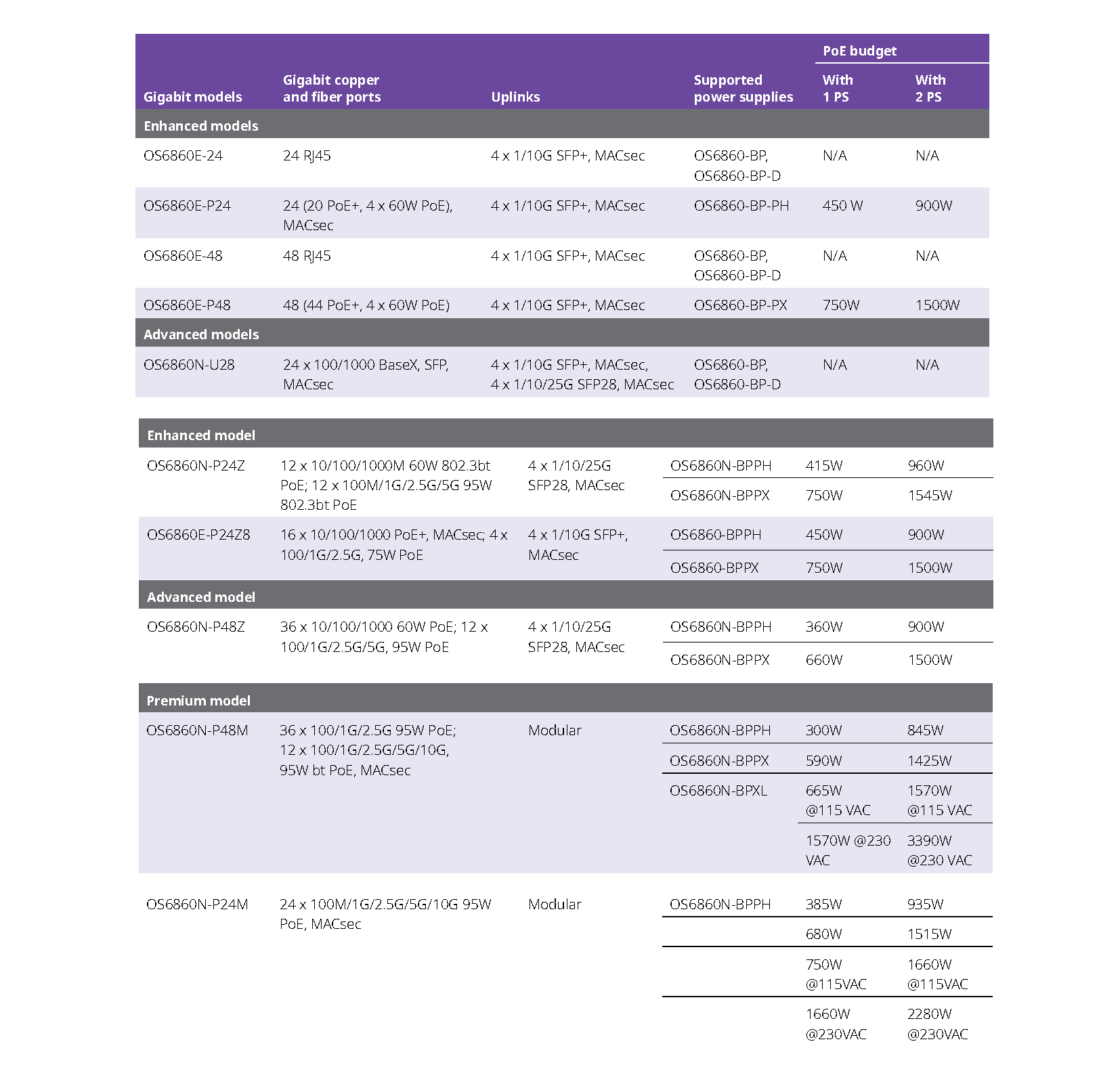 - OS6860N PoE 型號支援符合 IEEE 802.3bt 標準的 PoE 供電,每個連接埠最高可達 95W。