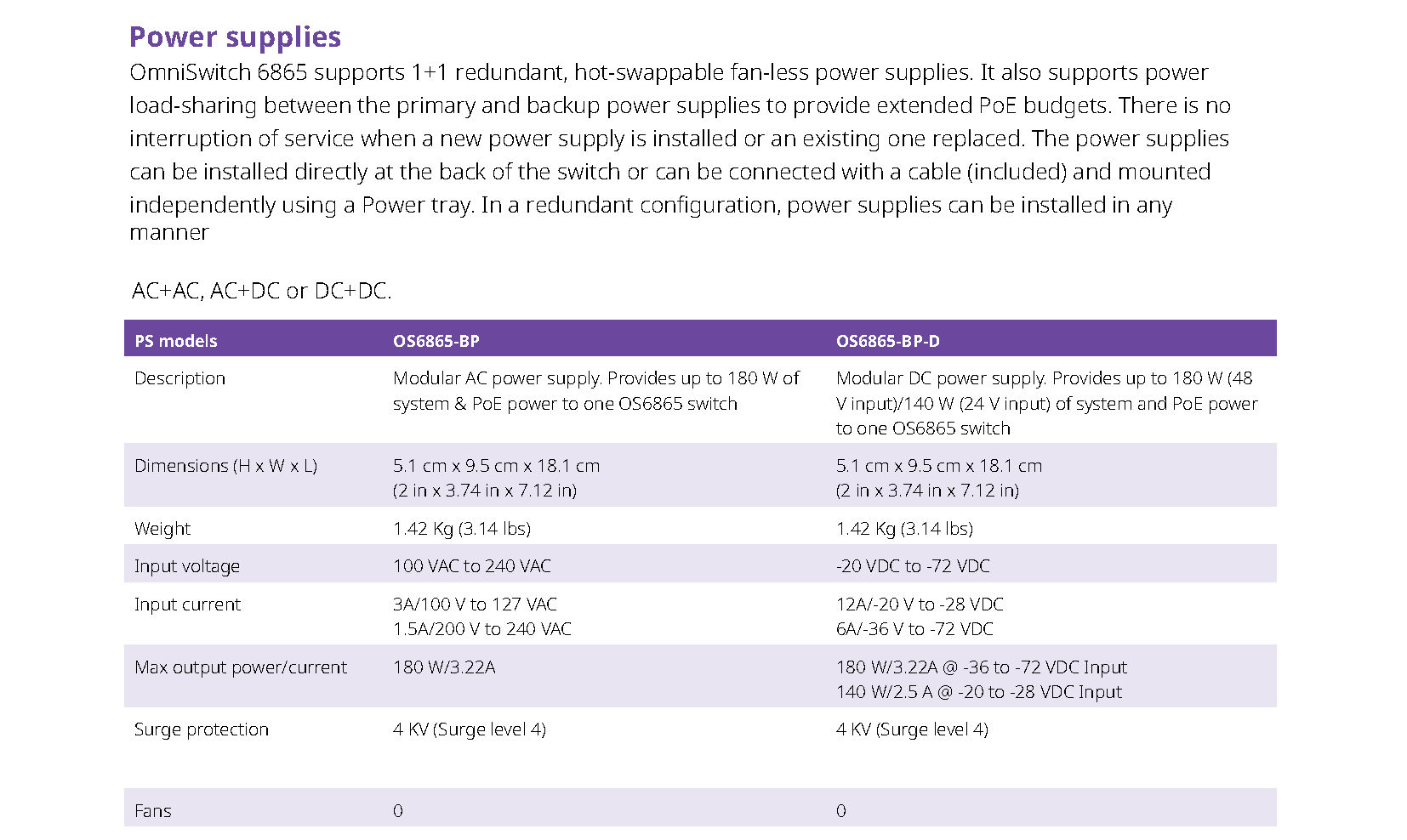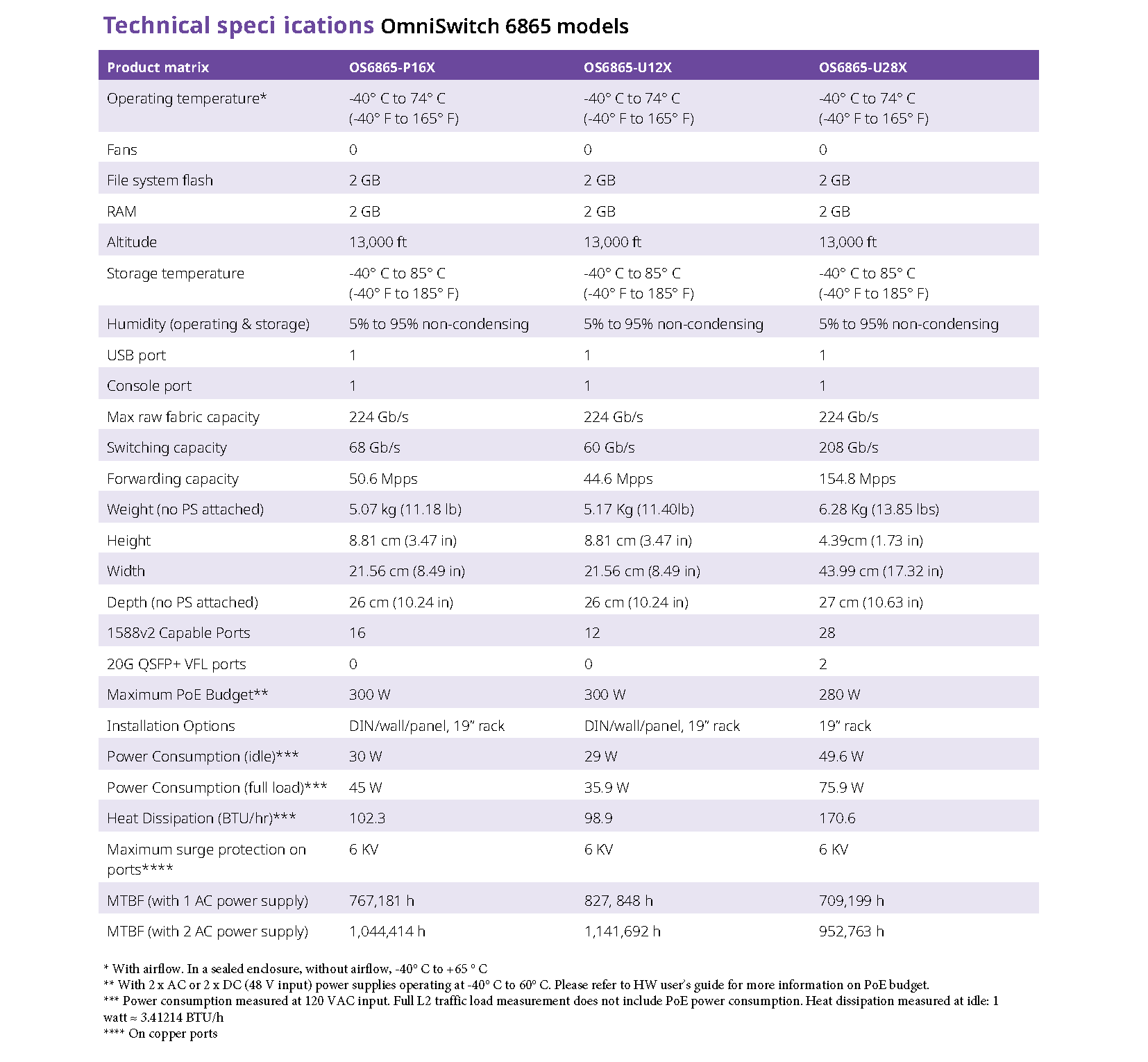 - 阿爾卡特朗訊 OmniSwitch 6865 是一款高性能加固型 PoE 交換機,可在極端溫度下運行,專為交通運輸和交通控制系統、電力設施、視訊監控和其他戶外應用而設計。 OS6865 擁有充足的 PoE 供電能力和 HPoE 功能,可為無線存取點、讀卡機、雲端攝影機、數位看板和感測器等裝置供電。