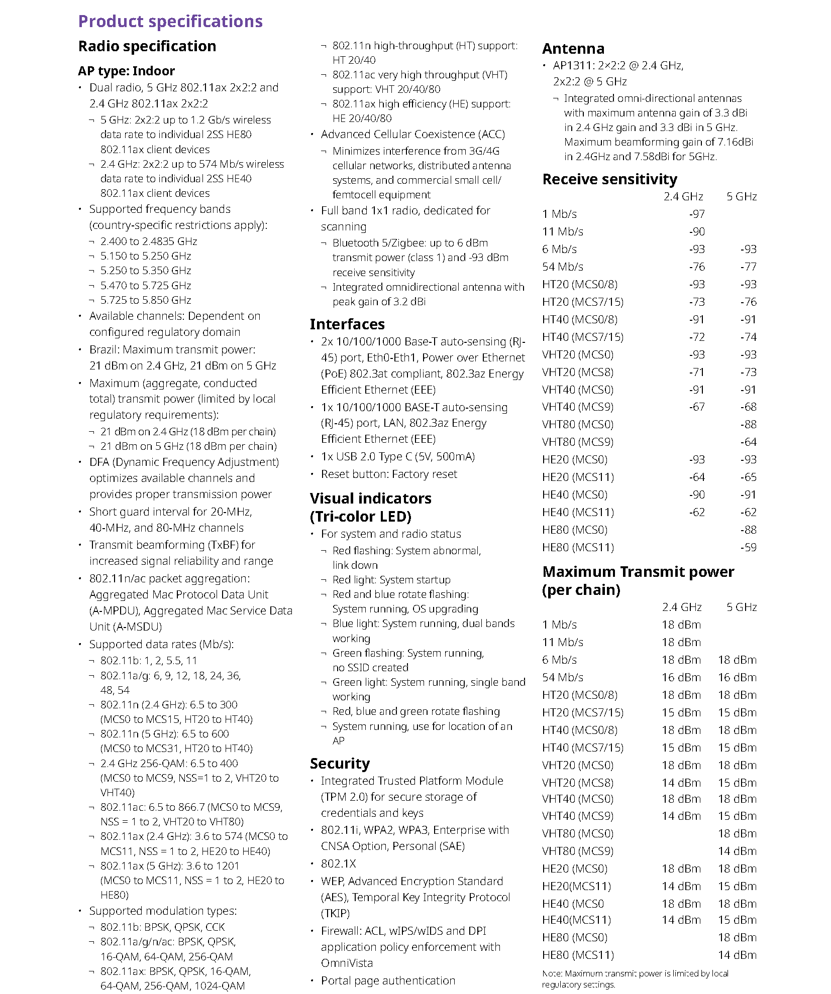 基於 802.11 ax 的高性能 AP1311 系列旨在滿足下一代移動和物聯網不斷增長的容量需求。 AP 內建3 射頻,雙射頻支援 2.4GHz/ 5GHz ,服務高密度Wi-Fi 用戶端,一個全頻段射頻專用於背景掃描,提供具有高度可預測性的WIPS/WIDS 服務,本質上改善了網路安全和 Wi-Fi 品質。它還擁有集成的藍牙/Zigbee 射頻,支持定位和樓宇物聯網服務。 AP1311 系列支援約 1.77 Gb/s 的最大聚合數據速率 ( 5 GHz 時為 1.2 Gb/s, 2.4 GHz 時為 573 Mb/s ),且為了支援更高的容量,存取點提供雙千兆乙太網路上行鏈路。