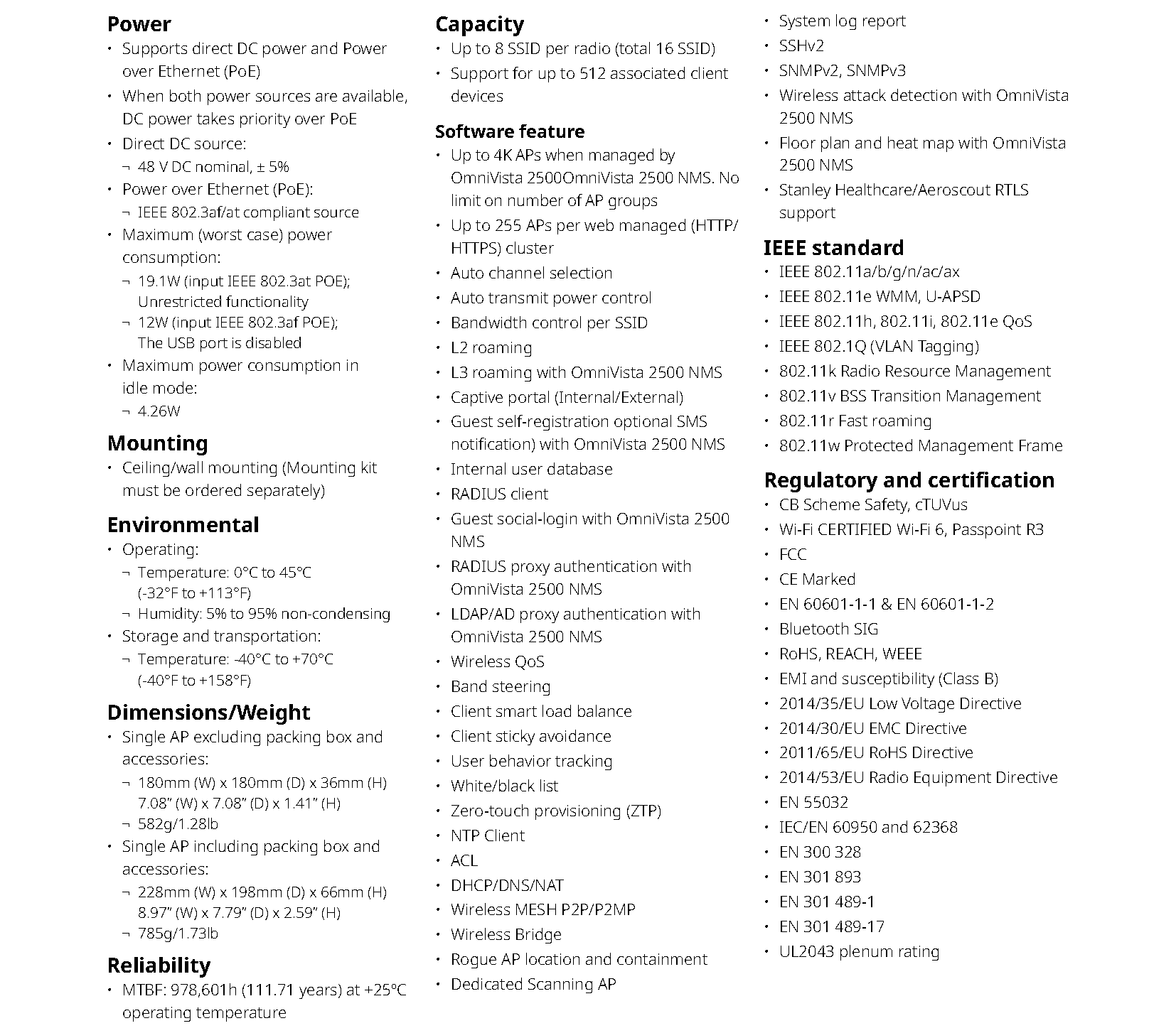 此系列存取點採用具有射頻動態調整功能的增強型 WLAN 技術,支援基於雲端架構 ( 公有雲或私有雲控制器) 的集中管理模式,支援集群分佈式高可靠模式部署、統一接取的安全網路存取控制、內建應用智慧和分析功,提供基於 AP 的晶片級 DPI 深度包檢測功能,可辨識包含 IM,SAP 等1000+ 應用,進行即時流分類、監控及 QoS處理。支援無線入侵偵測,NAT 功能,適用於需要簡單、安全和可擴展的無線解決方案的各種規模的企業。