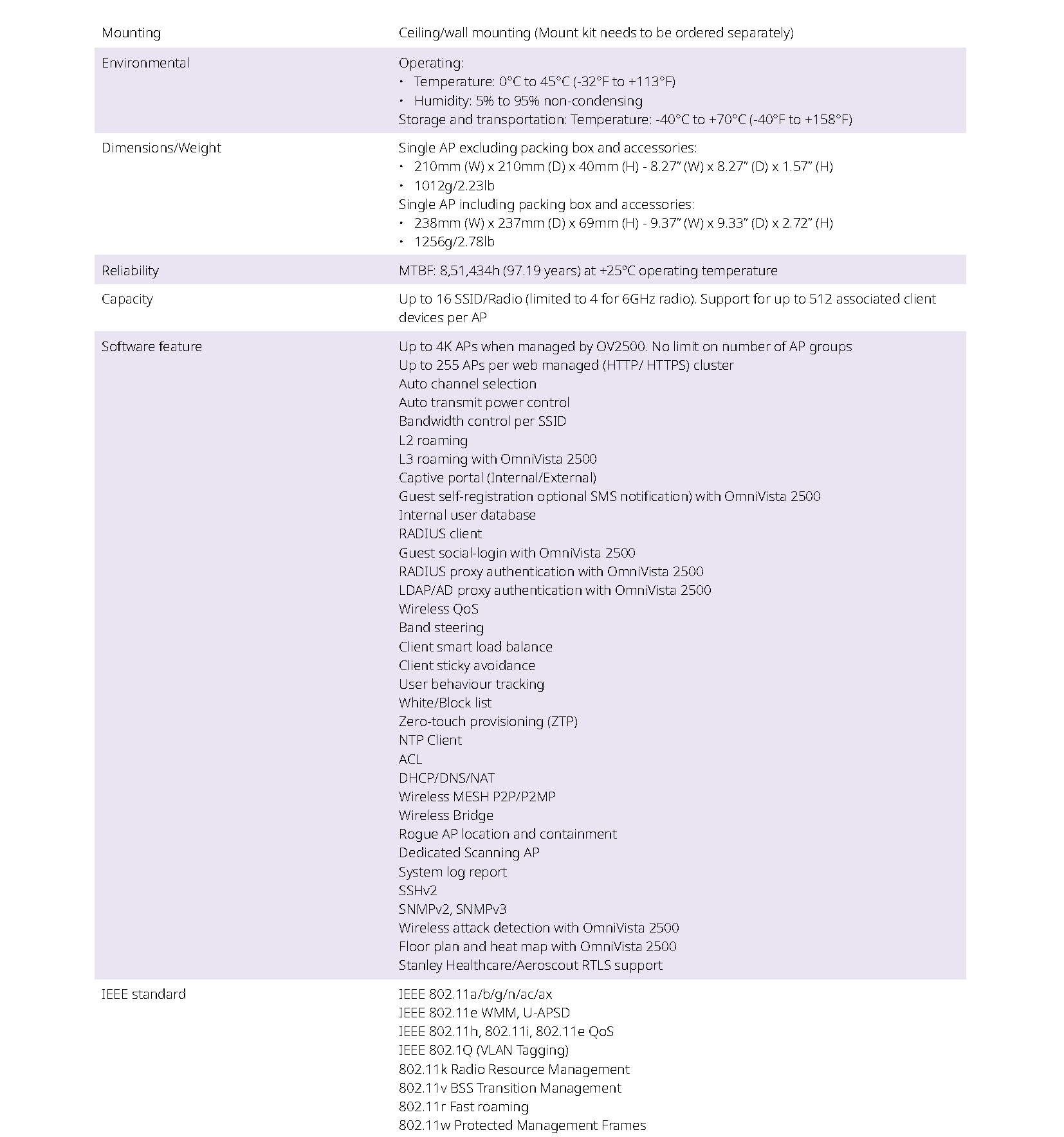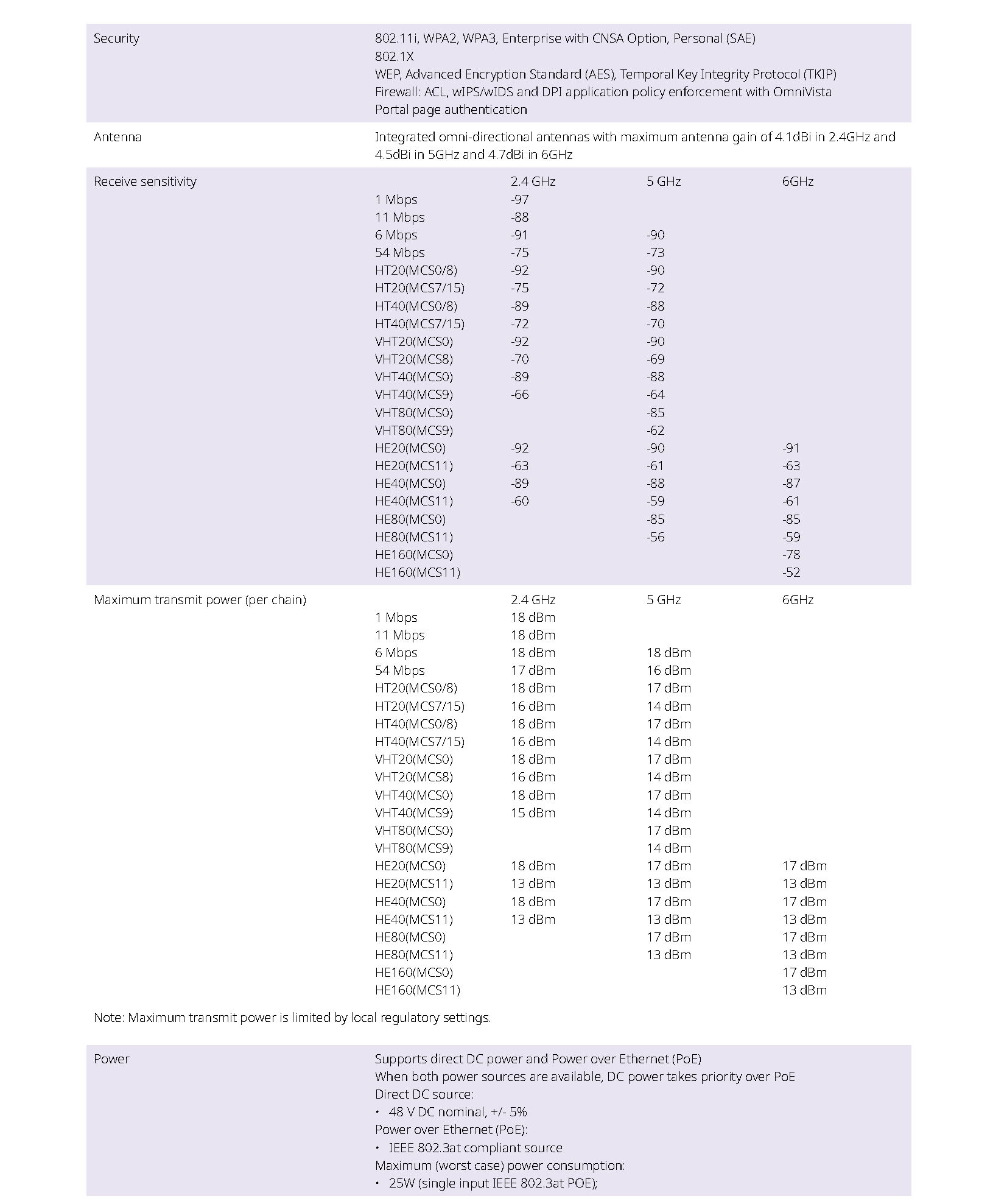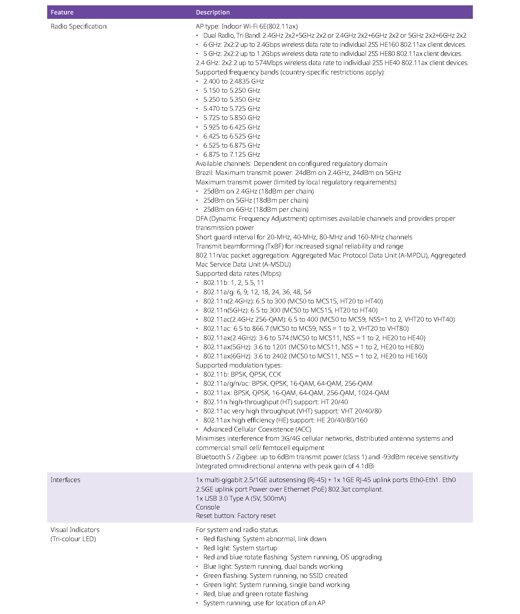 1.2Gbps,模式 2:2.4GHz 下 574Mbps + 6GHz 下 2.4Gbps,模式 3:5GHz 下 1.2Gbps + 6GHz 下 2.4Gbps)。接入點提供 1x 2.5Gb/s和 1x 1Gb/s 上行鏈路,具有乙太網路供電 (PoE) 故障自恢復和負載分擔能力。
