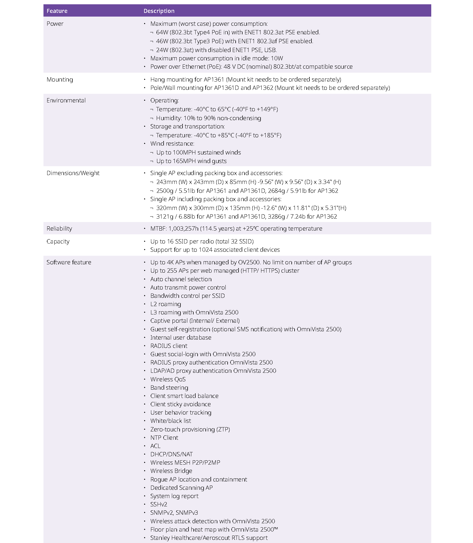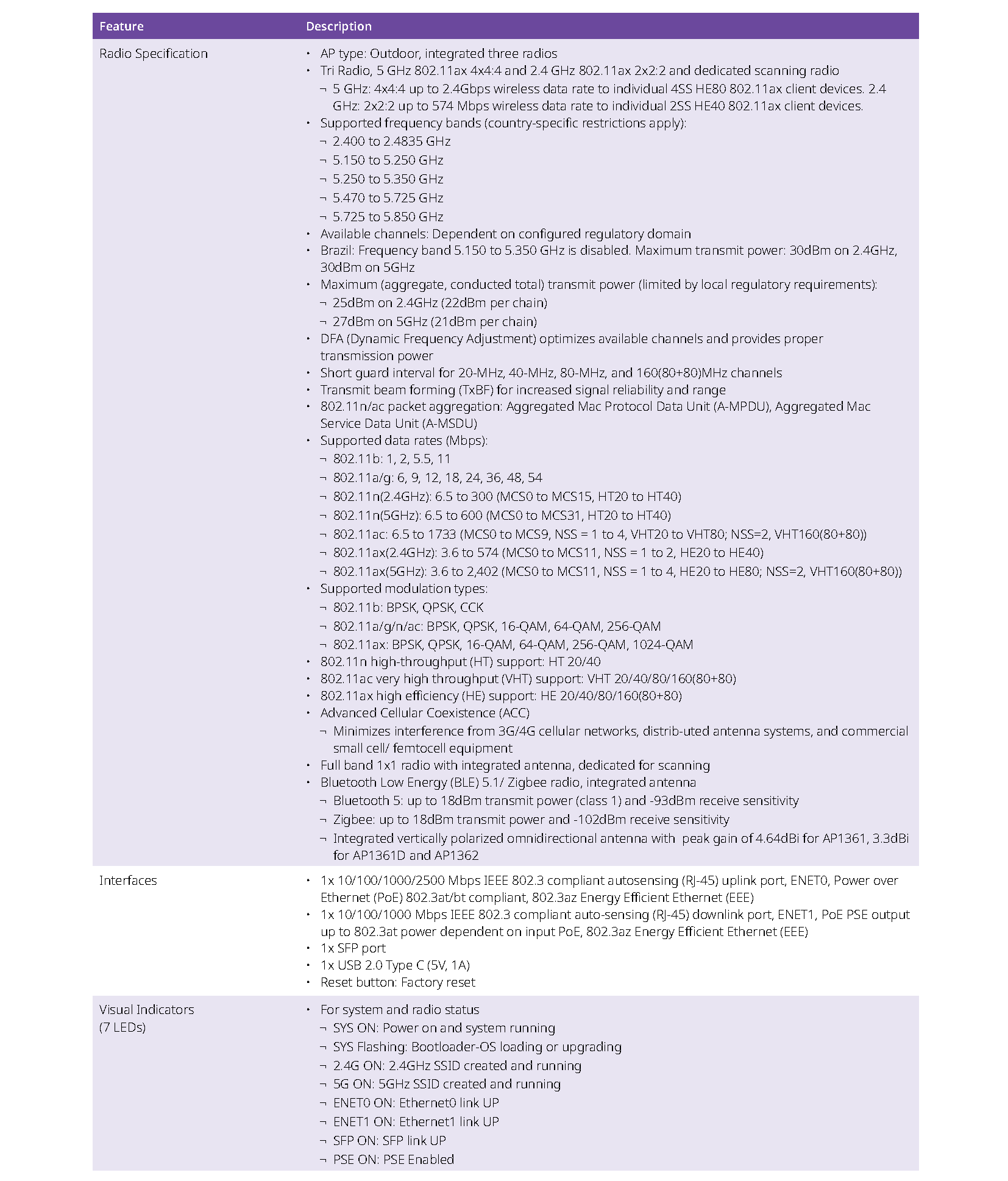 基於 802.11 ax 的高性能、耐用型 AP1360 系列旨在滿足下一代移動和物聯網不斷增長的容量需求。這些接入點內建三個 Wi-Fi 射頻;其中兩個射頻支援 2.4GHz/5GHz 頻段,服務高密度 Wi-Fi用戶端,全頻段射頻專用於掃描,提供具有高度預測性的 WIPS/WIDS 服務,從本質上改善了網路安全和 Wi-Fi 品質。它還擁有集成的藍牙/ Zigbee 射頻,支援定位和樓宇物聯網服務。接入點的防護等級為IP67 等級,適用於惡劣的室外環境,例如高溫和低溫、持續的濕氣和降水環境,具有工業強度的抗電湧保護。AP1360 系列支援約 3 Gb/s 的最大聚合資料速率 ( 5GHz 時為2.4Gb/s,2.4GHz 時為 573 Mb/s )。為了支援更高的容量,接入點由多千兆乙太網路上行鏈路供電。此系列產品可透過SFP 連接到網絡,實現長距離回傳,並為物聯網設備端點連接提供額外的下行鏈路乙太網路接口,以支援當今嚴苛的室外環境中的各種部署選項。