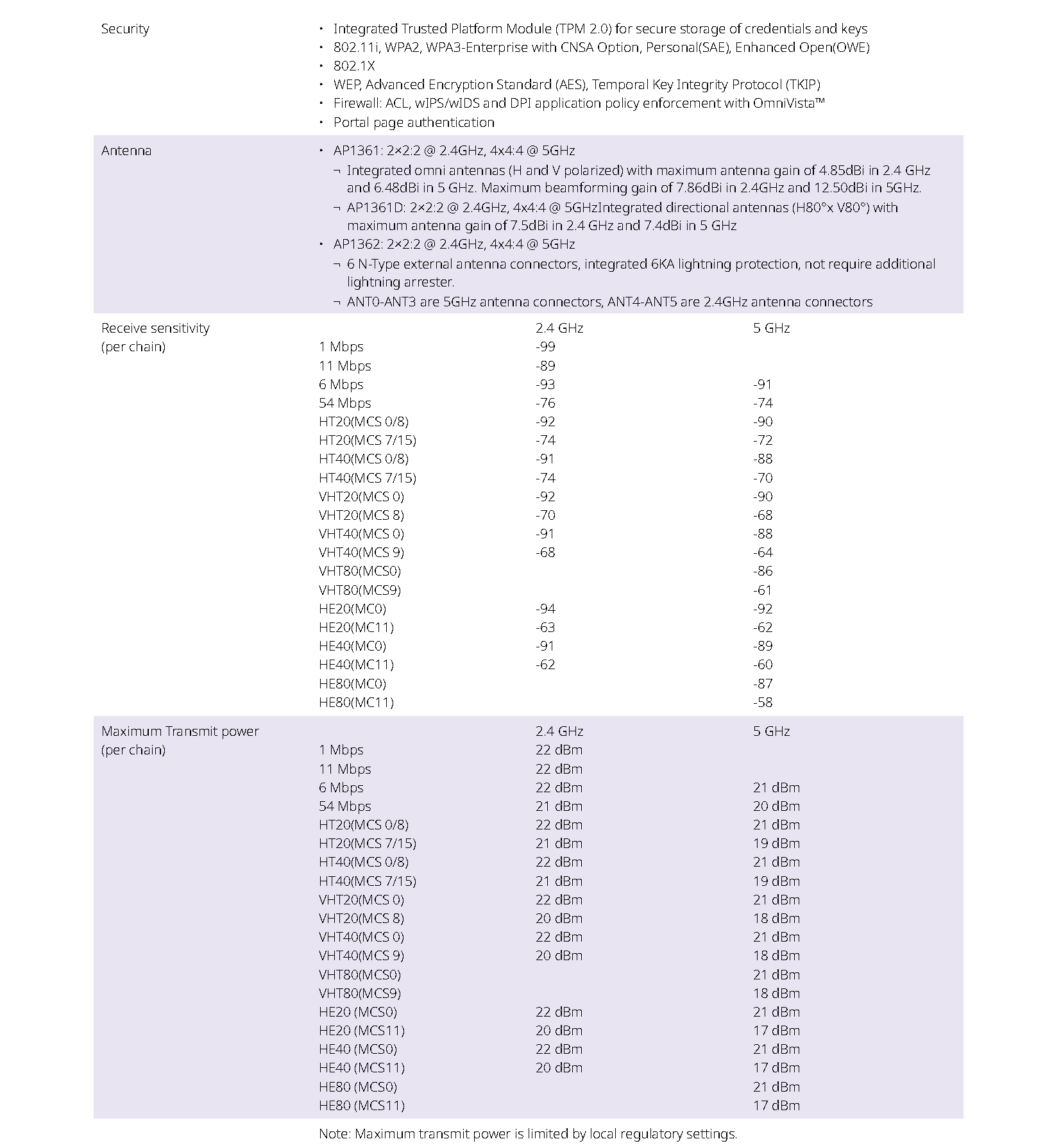 OmniAccess Stellar AP1360 系列支援所有必選的和一些可選的802.11ax 特性,包括高達 37 RU ( 資源單元) 的 UL-DL-OFDMA、總共6 個空間流的 UL-DL-MU-MIMO、1024-QAM 調變等,使包含室外場景在內的未來多樣化數位工作空間更可靠和更有效率。