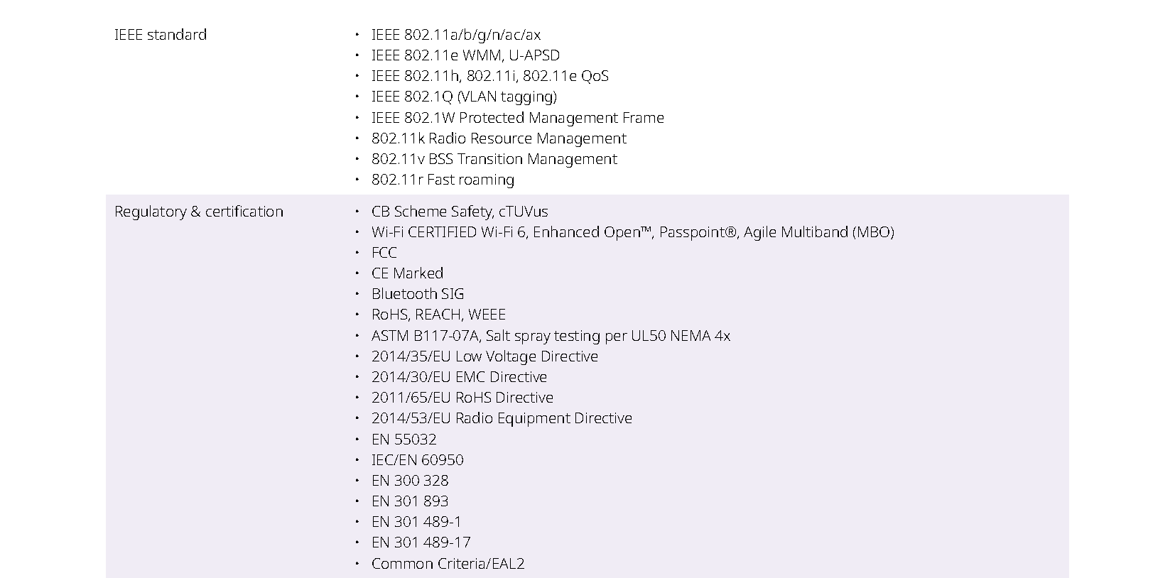 • OmniAccess Stellar AP1360 系列支援 WPA3 (一種全新的企業級和公共網路安全標準) 提供更強的安全性,透過在企業中使用高級安全演算法和更強大的密碼 ( 包括192 位元安全套件)提高 Wi-Fi 安全性。開放式非保護存取的公共空間,現在可