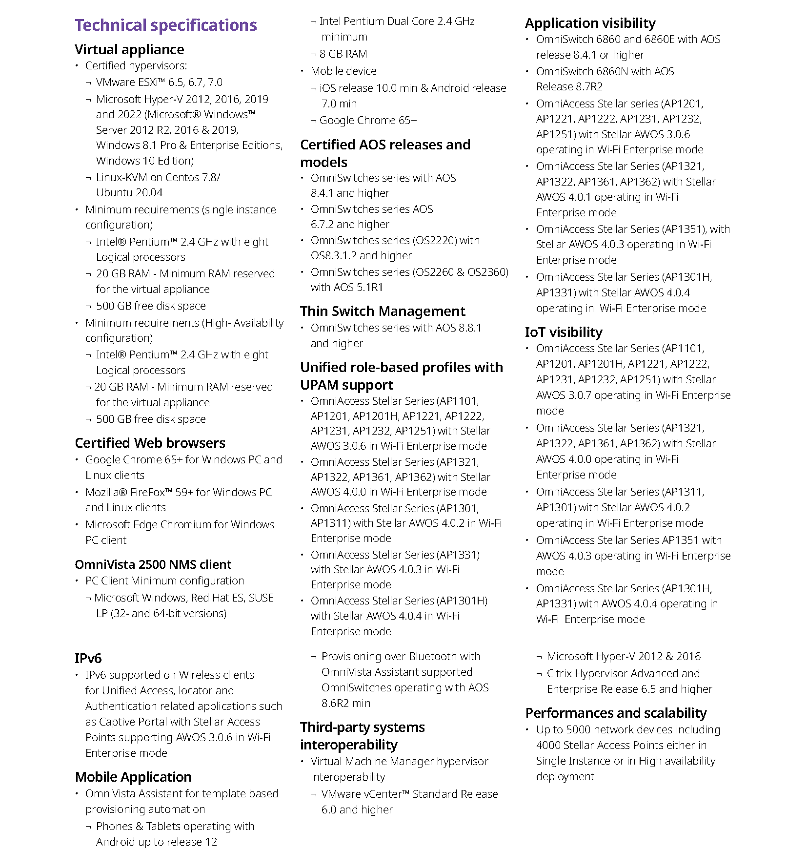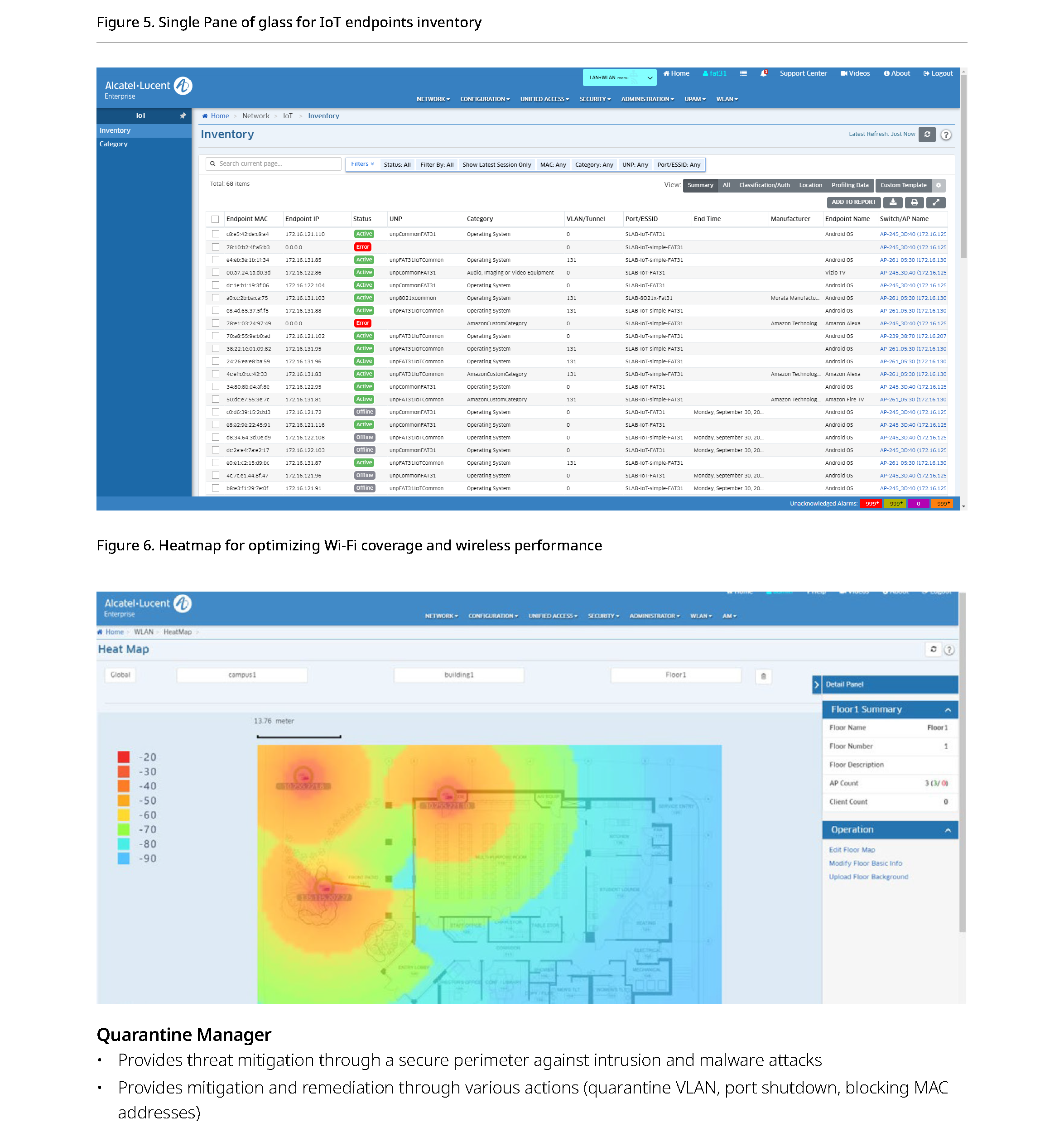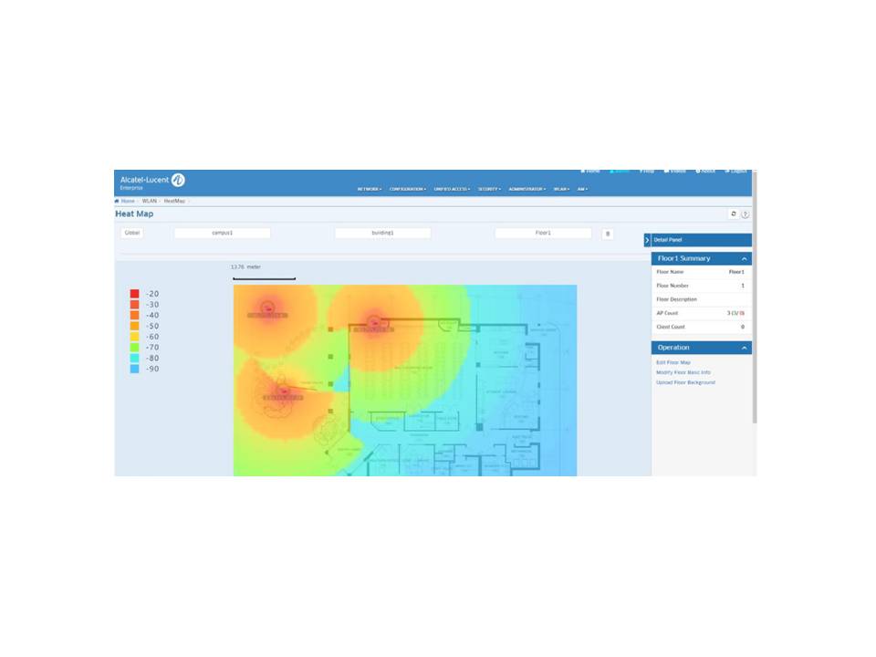無線網路管理平台:OmniVista 2500 可作為分散式無線架構的無線路網路的統一管理配置,具備無線網路分析,無線入侵偵測,無線熱圖,無線 DPI ( 深度套件檢測) 應用分析等功能,應用特徵庫升級/ 分發,支援 HA 高可用模式部署。