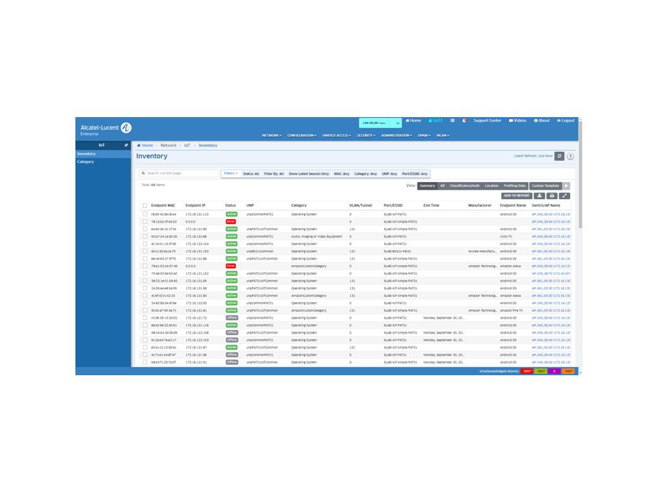 物聯網視覺化管理 :物聯網接取管理能基於雲端平台的終端指紋服務,提供網路上所有連接設備的全頻譜可視性和完整的設備指紋訊息,所有連接設備的指紋訊息,包括關鍵屬性,如設備類型、供應商、硬體版本、網路位置和時間訊息,帶物聯網終端分析的物聯網控制面板功能提供物聯網設備的實時和歷史摘要視圖,以便更好地進行資訊分析和報告。